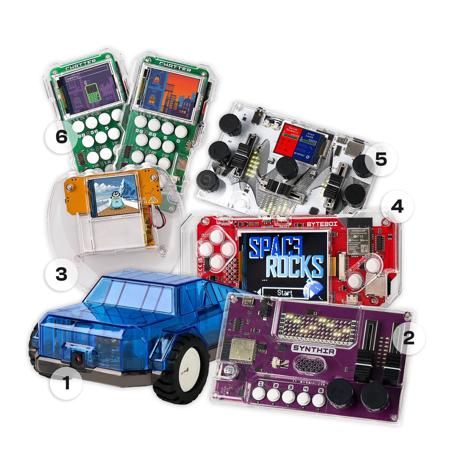 This bundle offers a broad introduction to STEM! You'll learn about robotics, AI, and computer vision (Wheelson); game development and electronics (ByteBoi); sound synthesis and music production (Synthia and Jay-D); coding and virtual pets (Codee); and wireless communication (Chatter).