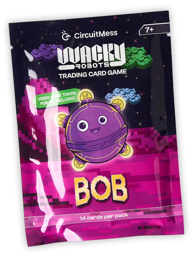 Unlock a new game with Bob, the repair bot of the Rayforge guild! This pack includes Bob's game token and 14 trading cards that add powerful repair abilities to your Wacky Robots card game deck.
