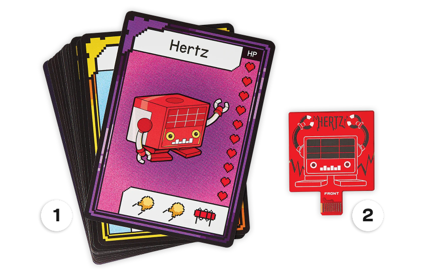 A Wacky Robot Bit Expansion is a collectible add-on pack for your CircuitMess Bit console. Each pack includes a unique, ready-to-use game token that unlocks an exclusive new game on your Bit, plus 14 collectible trading cards.