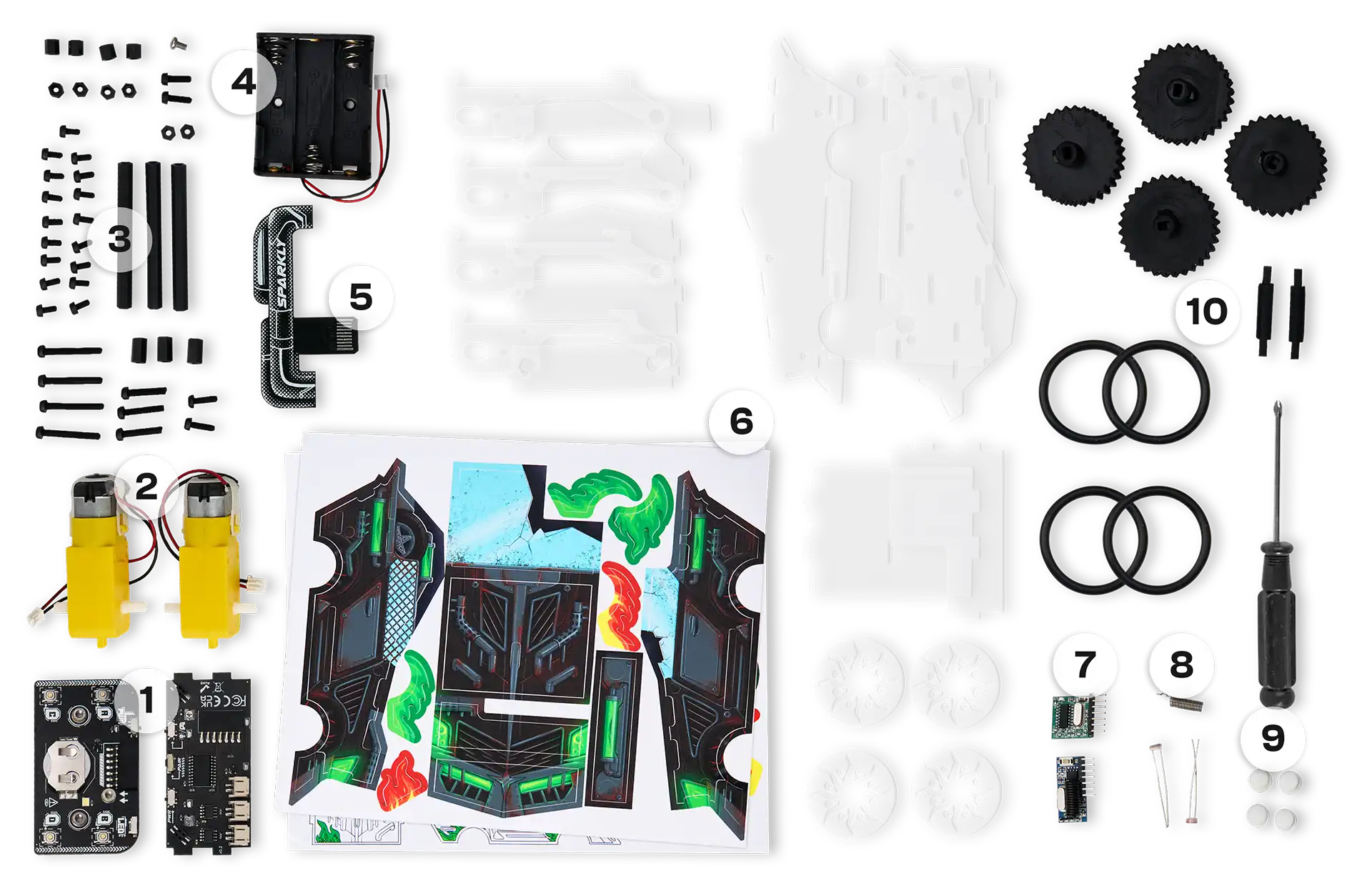 Building Sparkly is a hands-on way to learn about photoresistors – the components that let it "see" and react to light. You'll also get familiar with electric motors and how they power the car's movement, and general electronics.